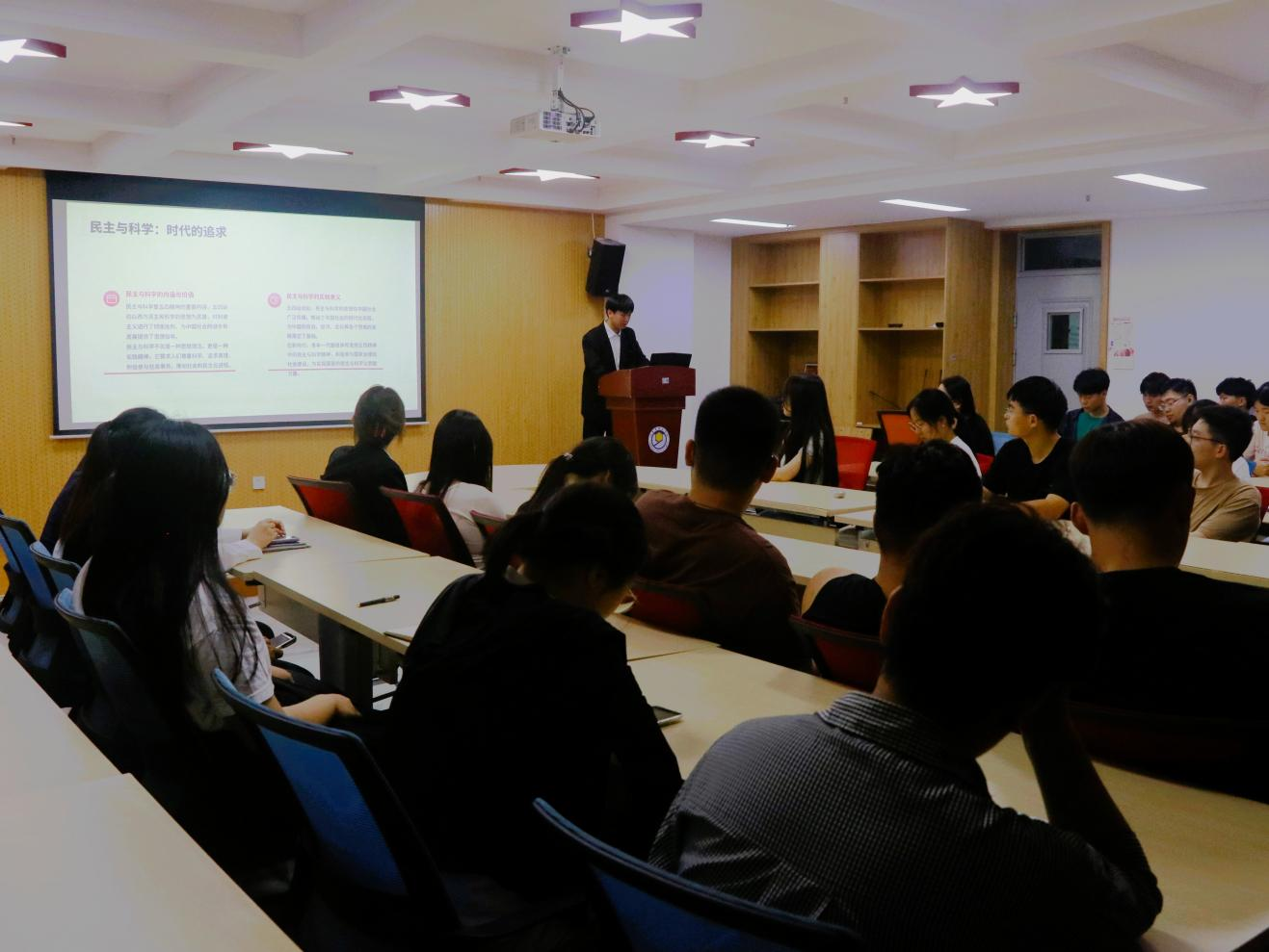 在分享环节中,团员代表围绕“青春与责任”、“青春奋斗”等主题,分享了他们对五四精神的理解和个人成长的故事。他们用真挚的语言和生动的事例,展现了当代青年积极向上、勇于探索的精神风貌,以及在学业、科研、社会实践等方面的卓越成就。这些分享不仅赢得了现场同学的热烈掌声,也激发了在场青年的共鸣和思考。