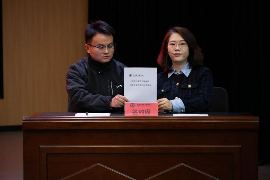 辅导员代表段文治和员工代表李权分别发言。向全院师生发出“牢守安全底线,紧筑安全防线;加强责任意识,构建和谐校园”的安全倡议,随后,魏丰君经理与各辅导员签订安全工作目标责任书。